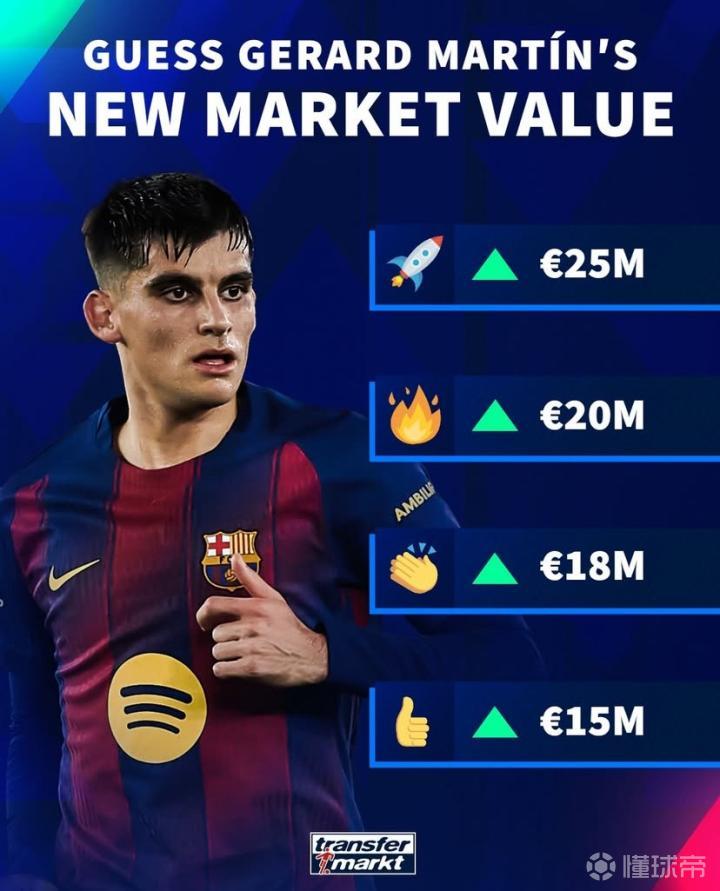 北京時間12月11日,在德轉(zhuǎn)即將“隆重”更新西甲球員身價這個“盛大”時刻,他們還“貼心”地預(yù)熱了巴塞羅那左后衛(wèi)赫拉德 - 馬丁的身價,并且“慷慨”地給出了四個上漲選項,最高那“天文數(shù)字”般的2500萬歐元,最低也“大方”地給到了1500萬歐元。